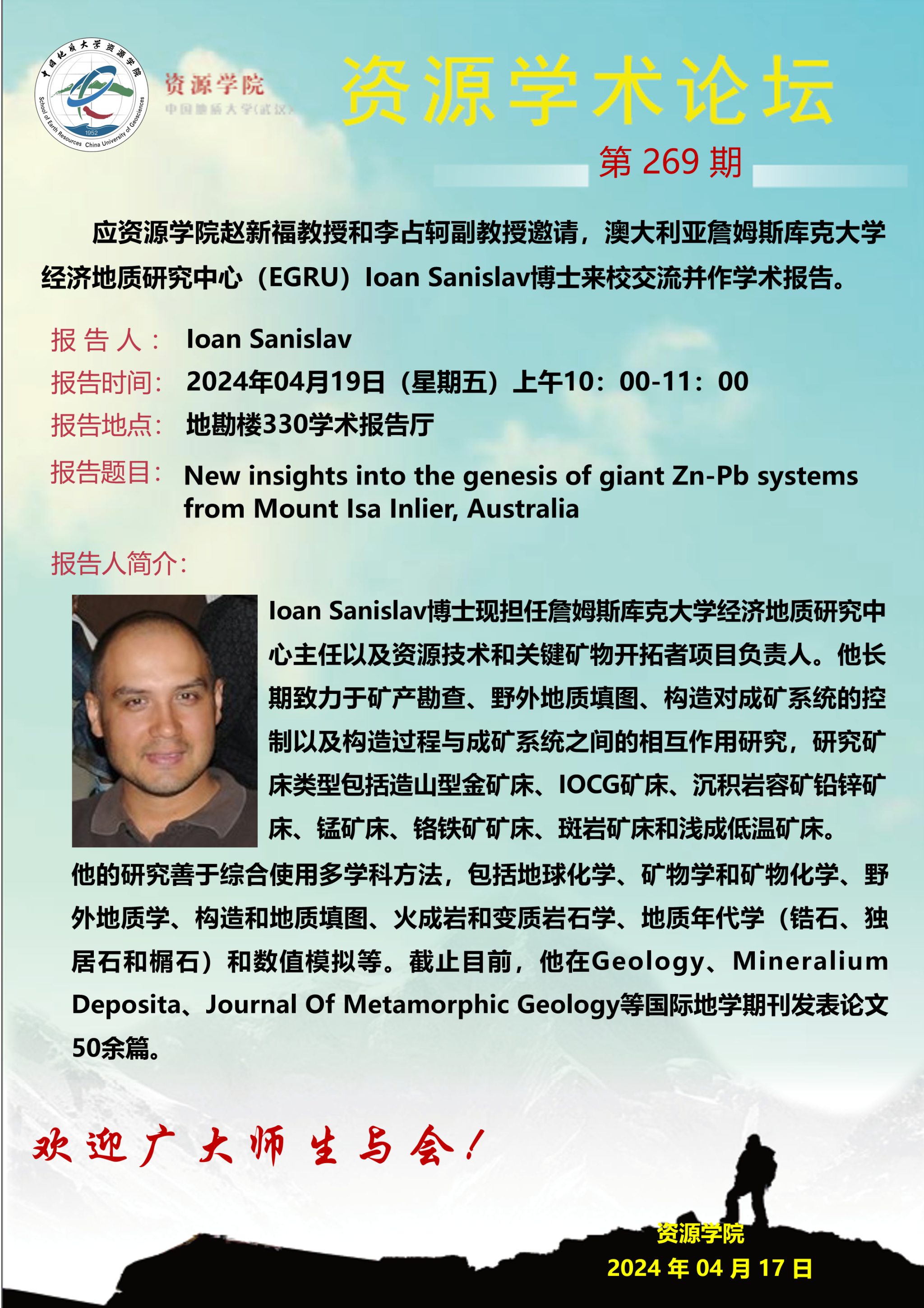 【4月19日】第269期资源学术论坛:Ioan Sanislav学术报告
