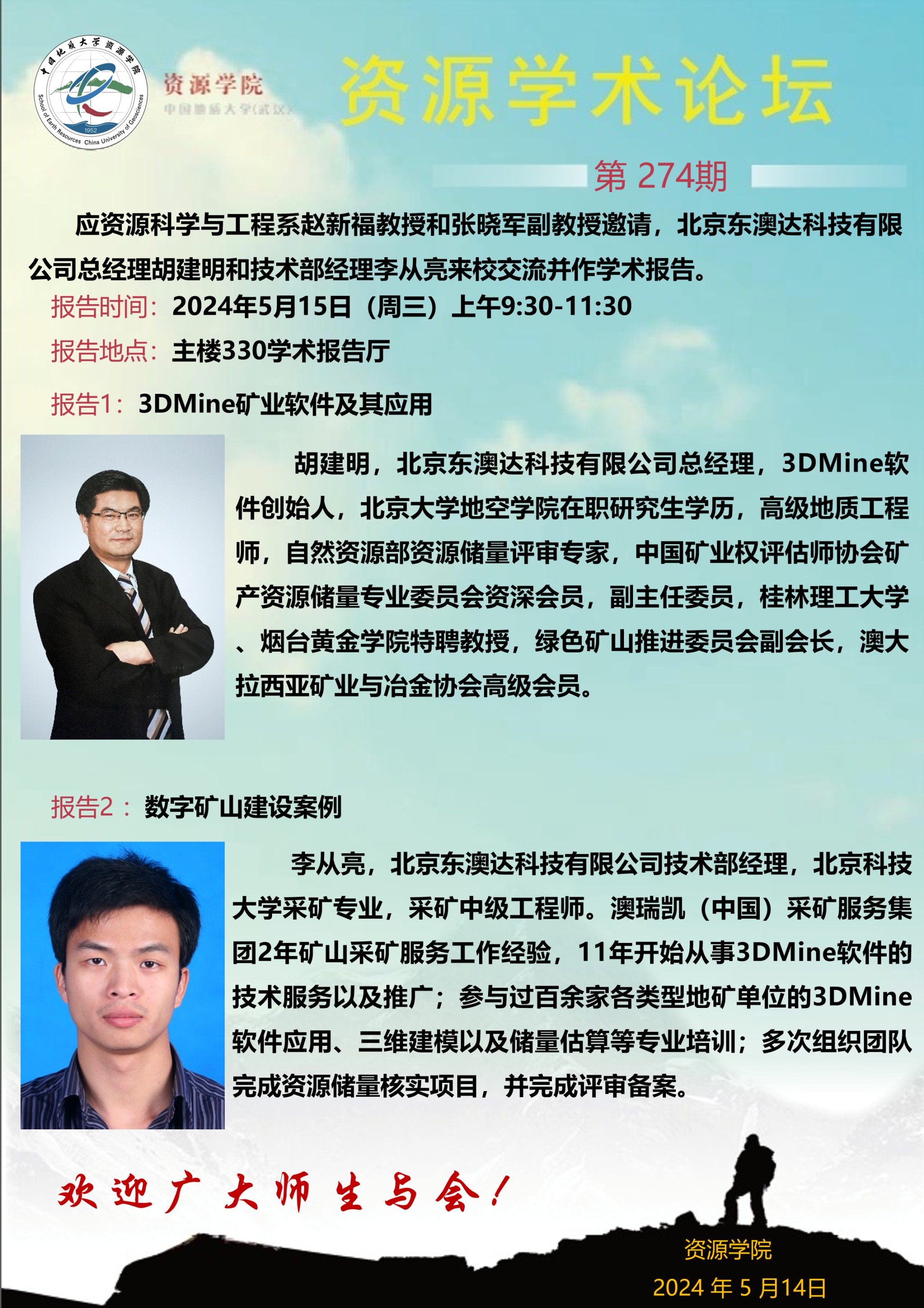 【5月15日】第274期资源学术论坛:胡建明、李从亮学术报告