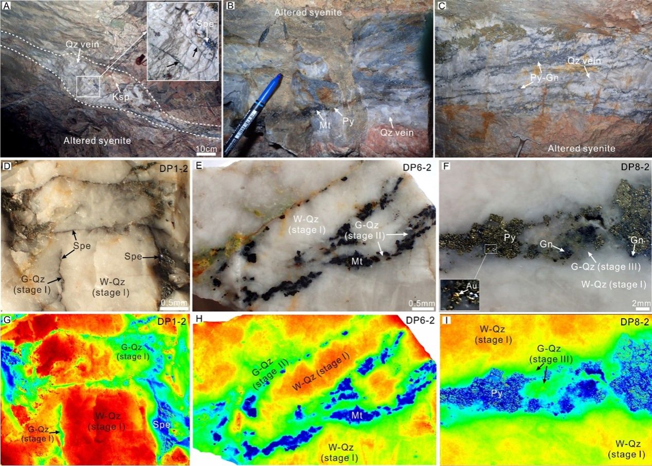 围绕以上研究问题,来自英国威廉集团官网(武汉)李建威教授团队的范高华博士以河北东坪超大型金-碲矿床(~120吨金和~225吨碲)为研究对象,综合了不同共生阶段多世代石英的微结构特征、流体包裹体、微量元素地球化学以及原位氧同位素分析,为金成矿流体的来源和复杂演化提供了重要见解。这些结果还用于揭示导致金沉积的机制。最后讨论了该方法在追踪脉状金矿床中流体流动及其微观变化方面的潜在应用。所研究的三个石英脉样品取自Au-6矿区的70号矿体(图1a-1c),它们分别代表第I阶段(样品DP1-2)、第II阶段(DP6-2)和第III阶段(DP8-2)。这些样品均含有第I阶段的乳白色石英(图1d-1f)和细脉状的烟灰色石英(图1g-1i)。第I阶段的石英通常与镜铁矿共生,而第II阶段和第III阶段的石英则分别与磁铁矿和含金硫化物共存(图1e-1i)。