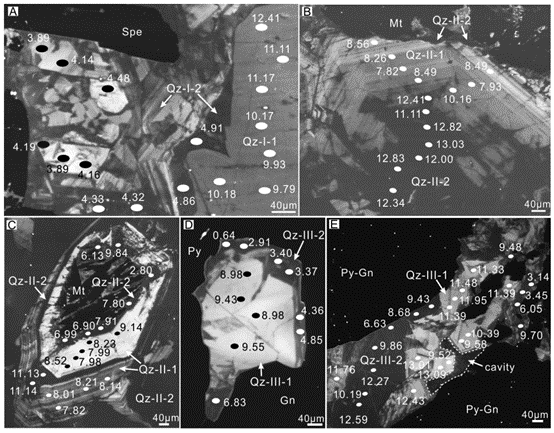 图2:研究样品的六个不同石英世代特征;数字代表氧同位素数值