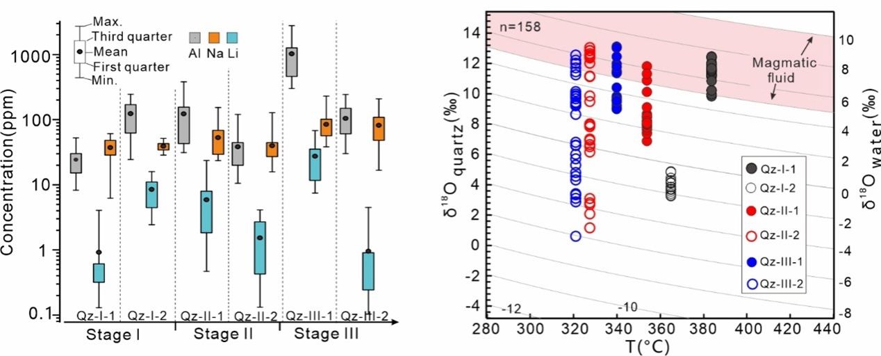 根据SEM-CL显微结构特征,每个阶段的研究样品均可划分为两个世代,即共有六个世代,分别为Qz-I-1、Qz-I-2、Qz-II-1、Qz-II-2、Qz-III-1和Qz-III-2,且每个世代表现出不同的CL结构特征(详见图2a-e)。然后该团队又综合SEM-CL和OM-CL结构,对六个石英世代开展了详细的流体包裹体、微量元素和SIMS氧同位素分析研究,总体上,六个石英世代的形成温度在320-380℃之间,Al和Li元素含量以及氧同位素表在不同世代之间表现出震荡式的变化特征(图2和3)。