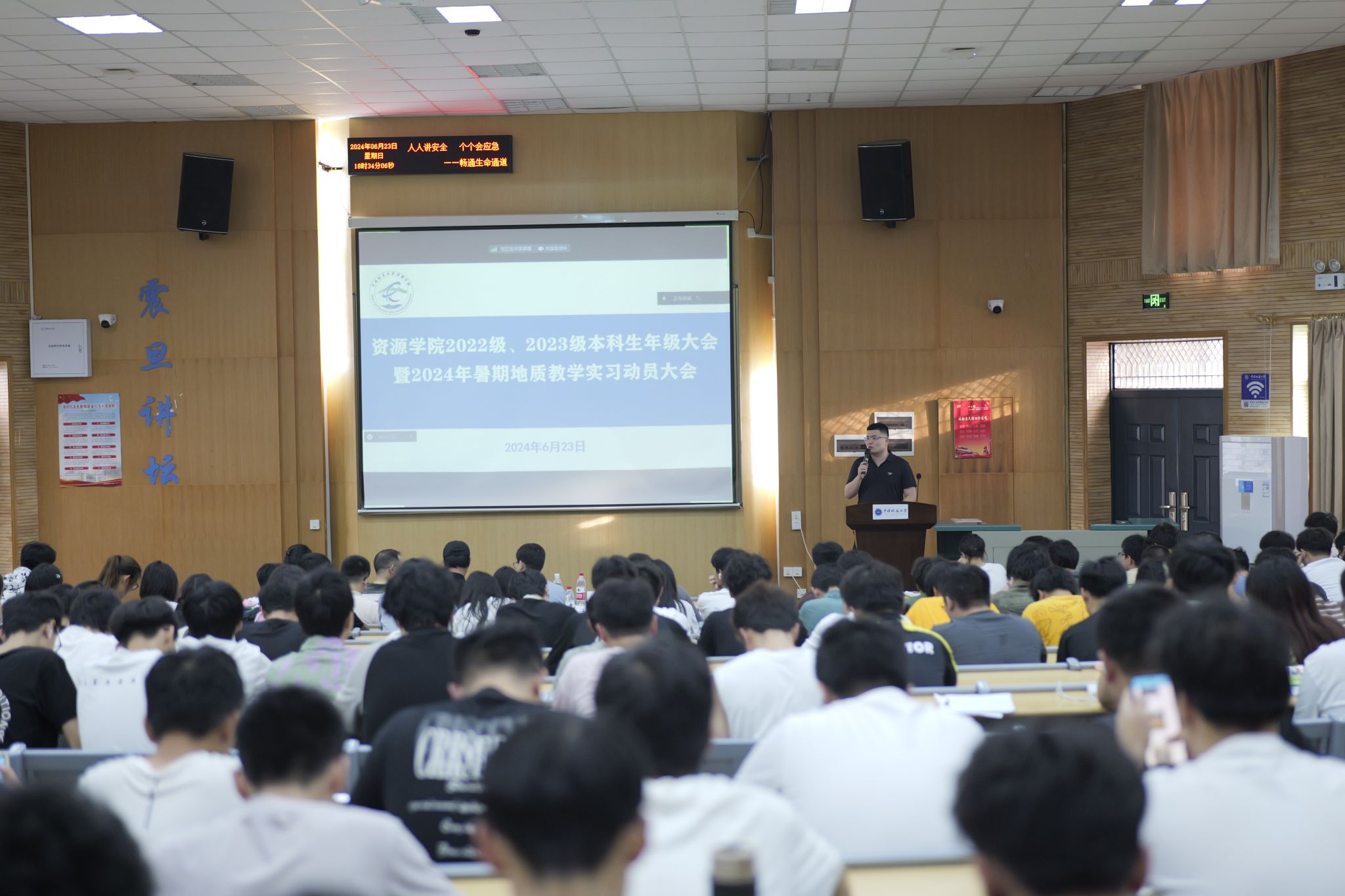 (通讯 冯思佳 彭鑫 摄影 李卓华 范汤豪)为做好大一大二年级学生暑期野外实习和社会实践的安排布置工作,提高学生在暑期的安全防范意识和能力,引导学生做好学涯规划,6月23日晚,资源学院举行2024年暑期地质教学实习动员大会暨2022级、2023级本科生年级大会。周口店实习队队长魏启荣、秭归实习队队长李嘉光、北戴河实习队队长董田、辅导员彭鑫,兼职辅导员冯思佳,学生代表陈宇、王雨乐、吴佳桁、余慧、敖扬洋,2022、2023级全体本科生参加会议。