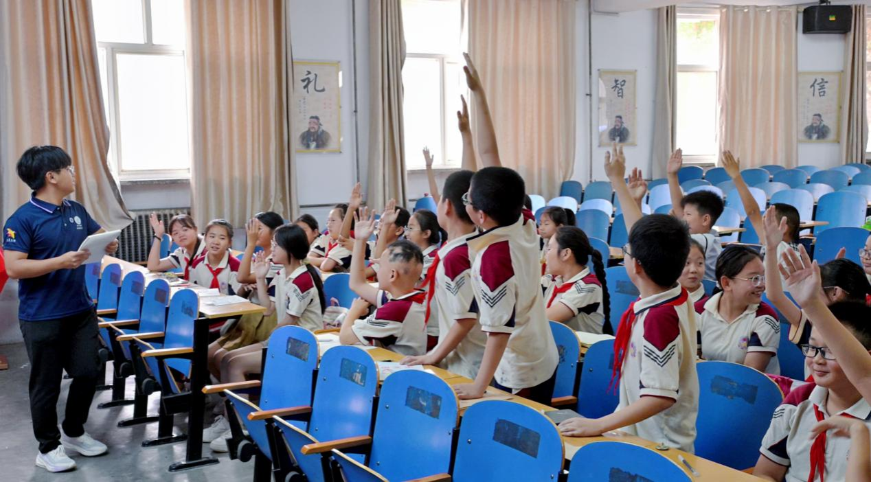 实践团成员李爱霞介绍课程情况并交流发言。她提到,实践团聚焦“益智实践”和“梦想启航”两大主题,多次集体备课研讨,精心打造11节“梦想课程”和9节“实践体验课程”,并在去年暑期支教的基础上用心雕琢,不断提升系列专项知识小讲堂教学质量。她表示,支教不仅是一次行动,更是一份责任和承诺,她将珍惜此次机会,怀着感恩,扛着责任,将梦想的种子播撒在孩子心中。