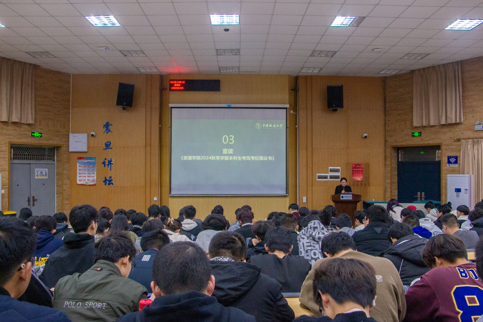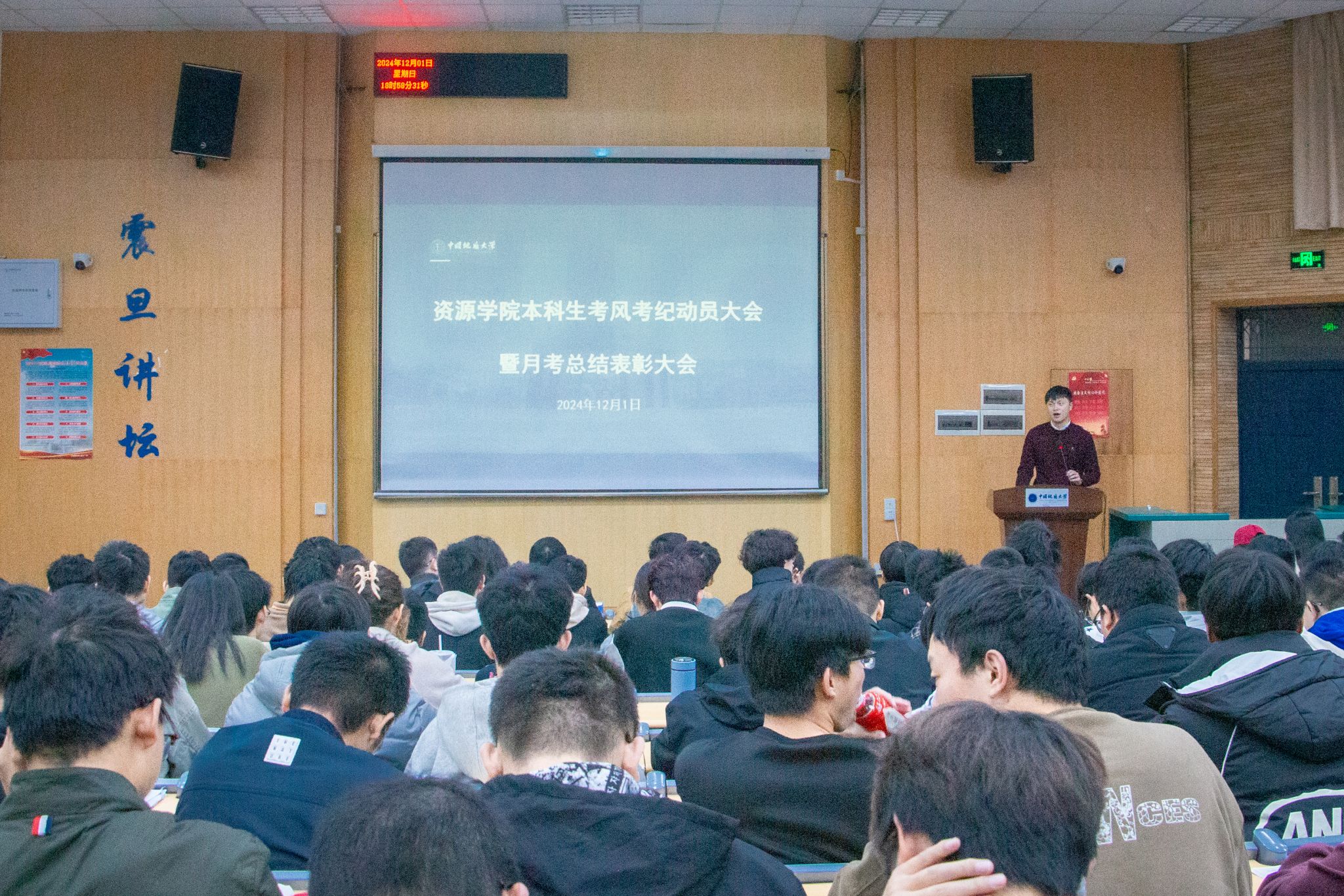 (通讯员 秦誉宁 摄影 汪佳玉 陆佳玉)12月1日,资源学院在南望山校区西区教三楼109教室举行本科生考风考纪动员大会暨月考总结表彰大会。学院党委副书记谭文伦,班主任付乐兵、周红、王维,2024级本科生辅导员刘睿,兼职辅导员、助理班主任及全体2024级本科生参加。刘睿主持大会。