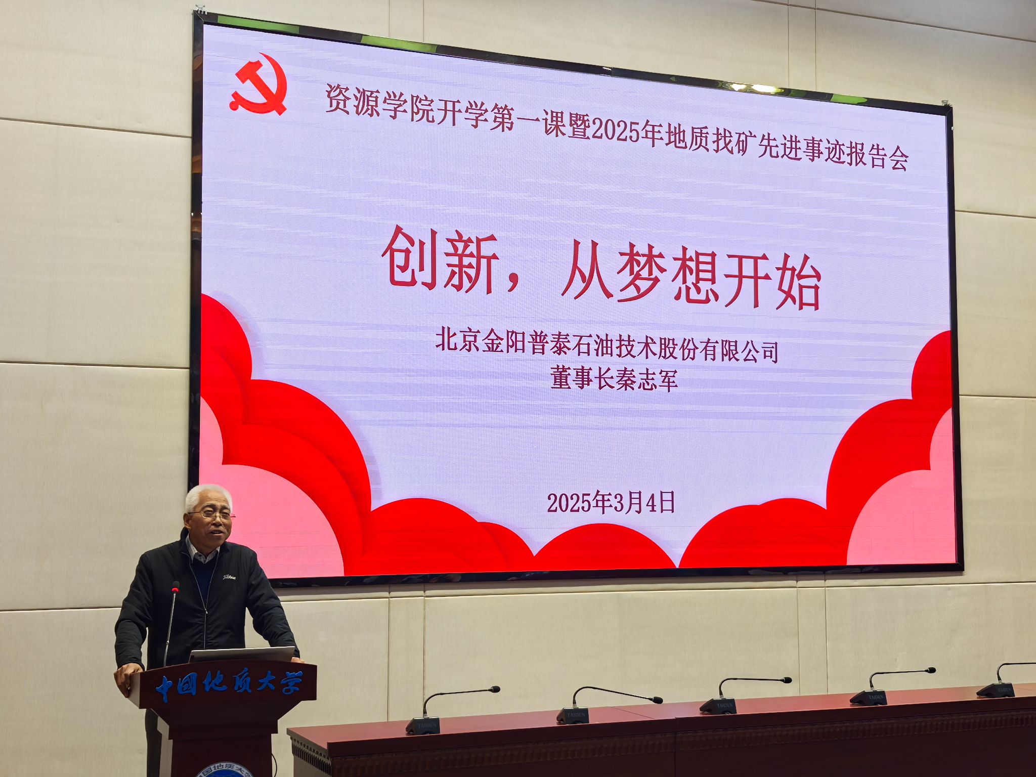 3月4日,学院举行“开学第一课暨地质找矿先进事迹报告会”。北京金阳普泰石油技术股份有限公司董事长秦志军、总经理袁钢辉,公司武汉代表胡甫强、王亚婧,学校党委学生工作部部长朱丹,资源学院党委书记汪再奇,党委副书记谭文伦,副院长李占轲,教师代表谢丛姣参加,举行了金阳普泰创新奖学金颁发仪式、校外兼职辅导员聘任仪式。秦志军在开学第一课中讲到,创新的源头在于梦想,而梦想的实现离不开切实的行动、扎实的学习和长久的坚持。他鼓励同学们要燃起梦想的火苗,敢想敢干、巧干实干,不畏艰难、不怕失败,在不断的实践中勇于创新,敢于追逐更加辉煌的梦想!