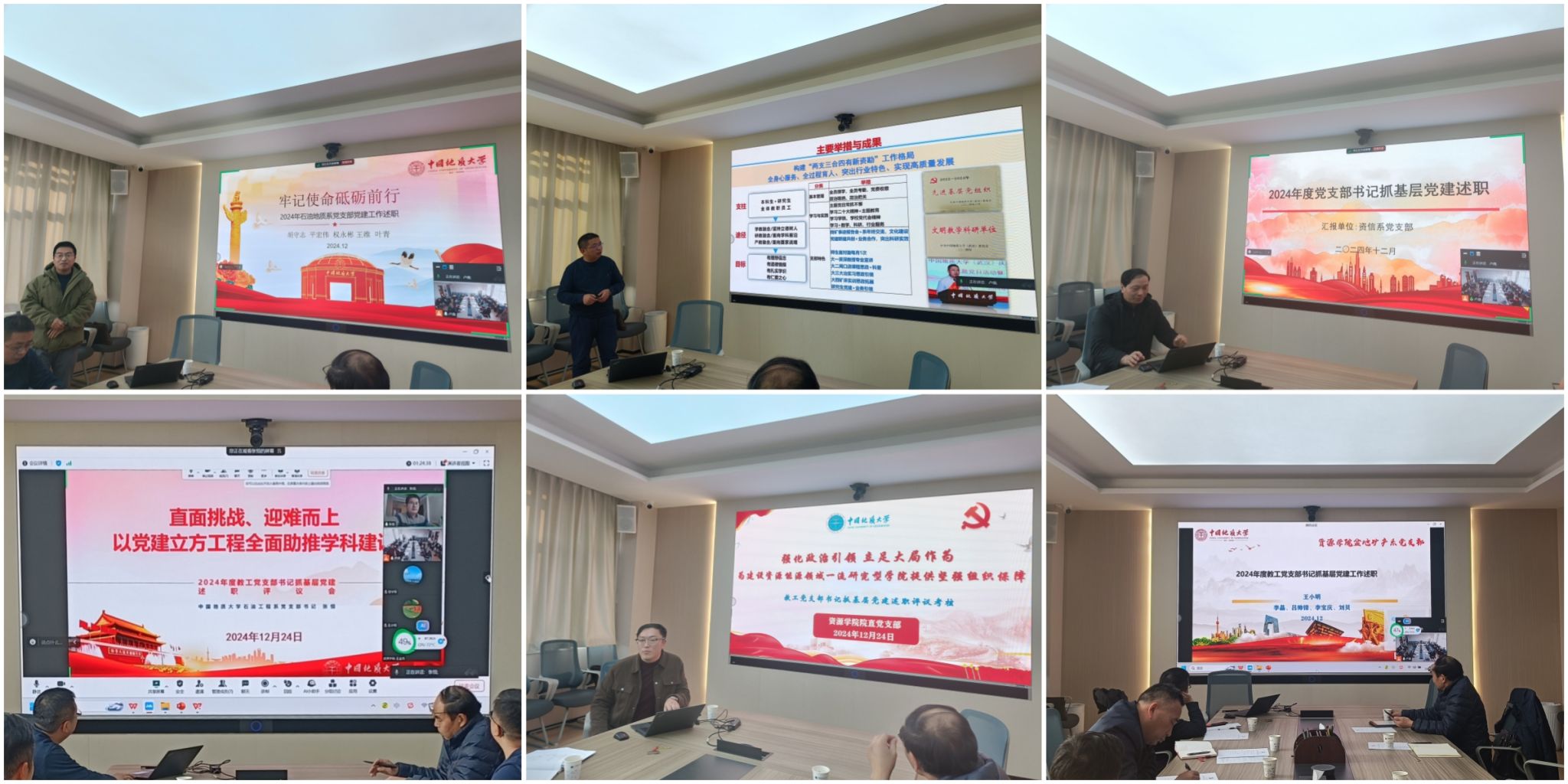 会议强调,召开2024年度教工党支部书记抓党建工作述职评议会,既是对各党支部一年来工作的全面盘点梳理,也是一次学习交流,更是对党支部书记党建工作意识和第一责任人意识的督促提升。通过述职评议相互学习和交流,共同查问题、找差距、明方向,有利于推动学院党建工作提质增效,促进党建与业务融合发展。各党支部要深入学习全国高校党建工作会议精神,抓学习、讲奉献、重谋划、促发展,团结带领师生深入推进“时代新人铸魂工程”,着力加强高层次人才培育和作用发挥,引领青年教师成长,激活教师团队,推进学科交叉融合,聚焦国家能源资源发展战略大力推进有组织的科研,实现重大项目、标志性成果新突破,为建设资源能源领域一流研究型学院,圆满完成学校“十四五”建设目标作出应有的贡献。